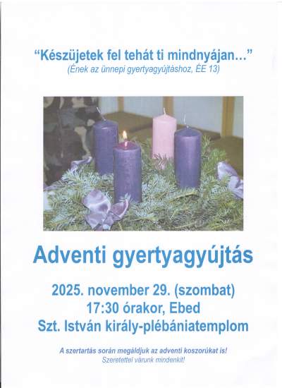Advent 1. vasárnapjának előestjén ünnepi gyertyagyújtásra és esti dicséretre várjuk a Kedves Híveket, mellyel belépünk az új egyházi évbe.